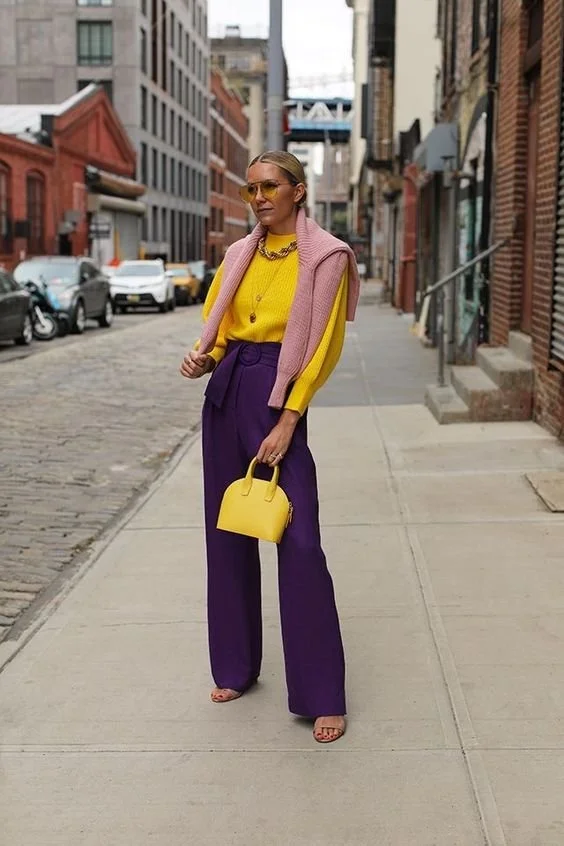 Otra opción es que tengas un nexo “amable” entre uno de esos colores complementarios, es decir, que tomes como puente un color análogo y te voy a poner esta imagen de esta chica que borda el look y con el que vas a ver perfectamente lo que te quiero decir.